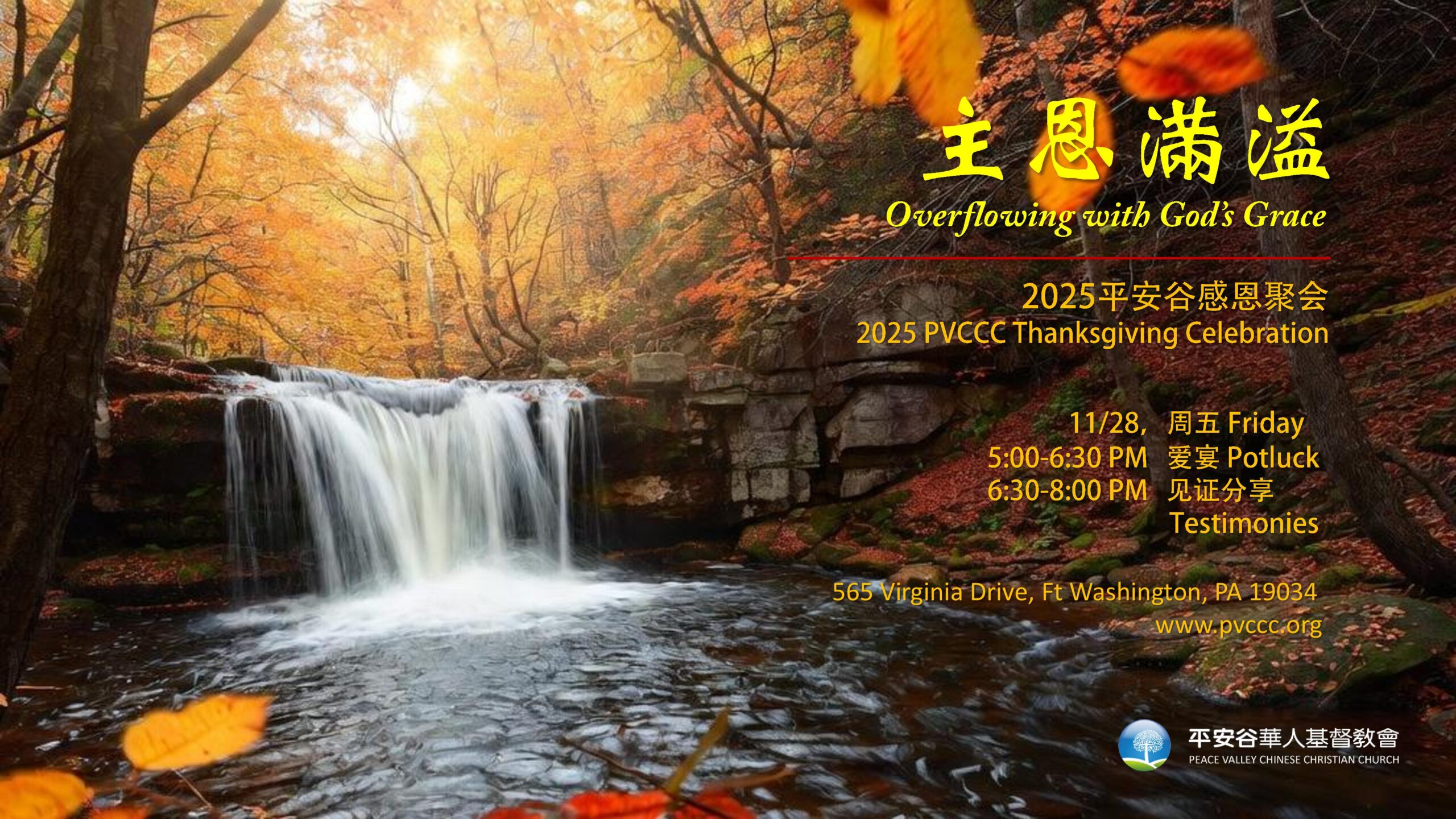 感恩的季节里, 我们欢迎您和您的家人、朋友参加11/28(周五)下午五点举行的2025平安谷感恩聚会,一起数算神满溢的恩典。In the season of Thanksgiving, we warmly welcome you, your family and friends to join 2025 PVCCC Thanksgiving Celebration at 5:00 PM, 11/28 (Friday) to count God’s overflowing grace. |