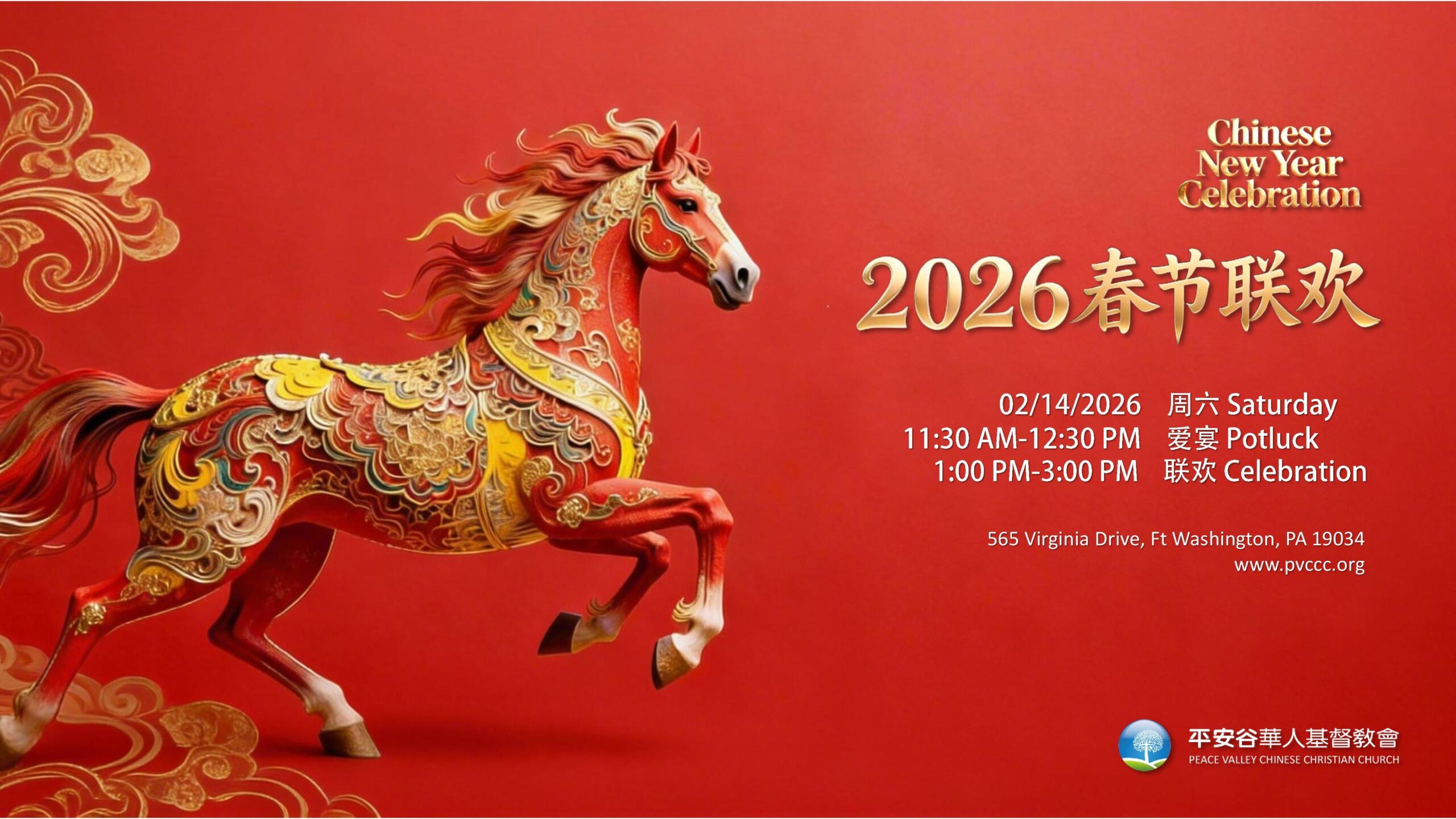 热忱欢迎您和您的家人、朋友02/14(周六)参加2026平安谷春节联欢,一起共庆新春佳节。You, your family and friends are warmly welcome to join our 2026 Chinese New Year Celebration on 02/14/26, Saturday. |